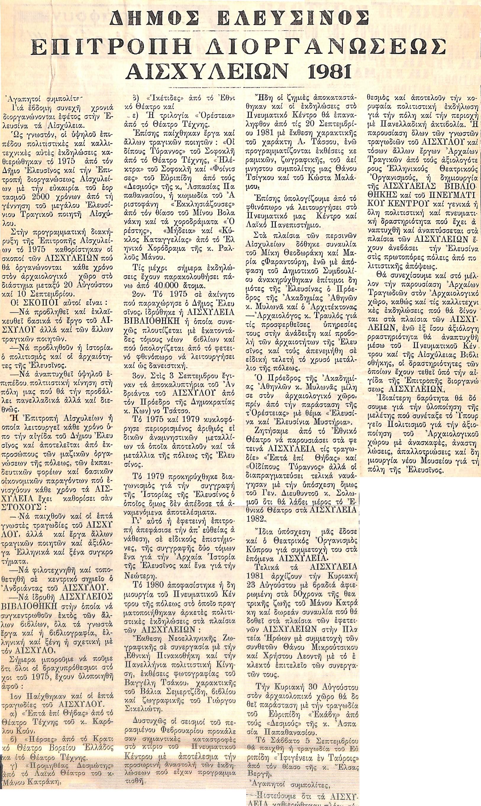 Άρθρο "Δήμος Ελευσίνας: Επιτροπή Διοργανώσεως Αισχυλείων 1981"