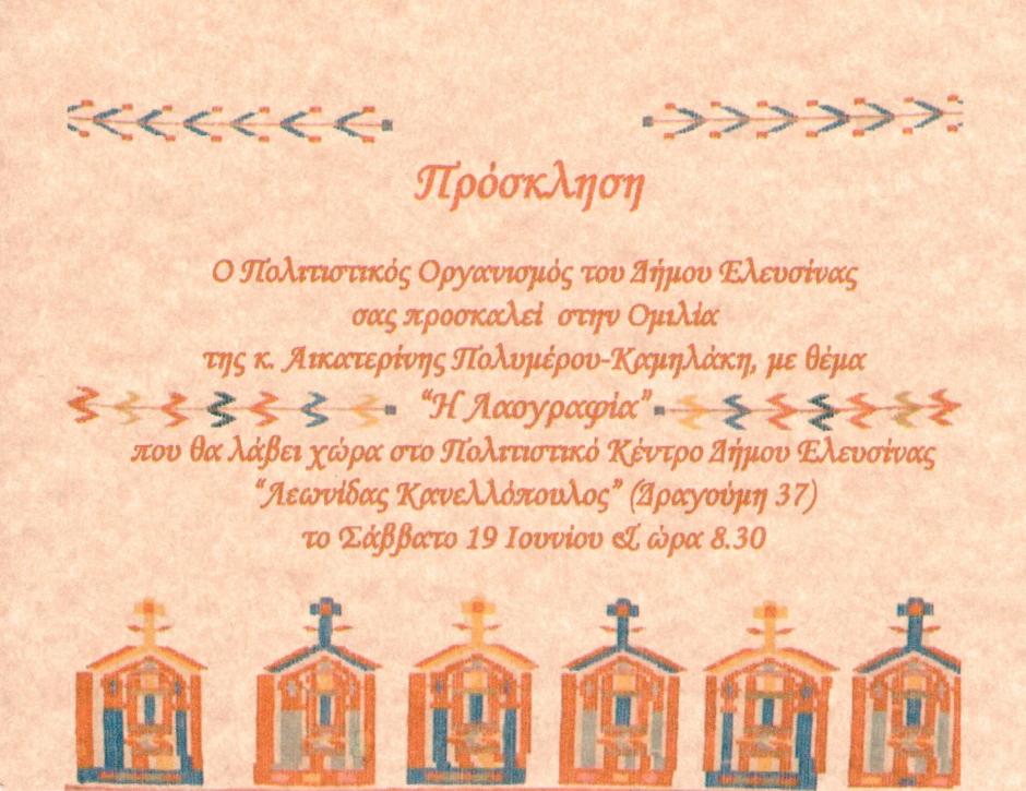 Πιθανά λόγια συγγραφέα: "Ο Πολιτιστικός Οργανισμός Δήμου Ελευσίνας σας προσκαλεί στην Ομιλία…"