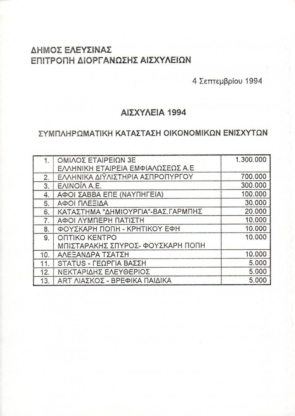 Συμπληρωματική κατάσταση οικονομικών ενισχυτών στις εκδηλώσεις των Αισχυλείων 1994