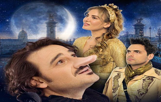 Ο Βασίλης Χαραλαμπόπουλος ενσαρκώνει τον εκκεντρικό ήρωα με τη διάσημη μύτη και την πολυσχιδή προσωπικότητα, έναν ξεχωριστό, πολυτάλαντο άνθρωπο, τρυφερό, αστείο, ποιητή και δεινό ξιφομάχο και κατ’ εξοχήν τραγικό πρόσωπο, που θα παραδεχτεί τον μεγάλο του έρωτα για την εξαδέλφη του Ρωξάνη μόνο λίγο προτού ξεψυχήσει.