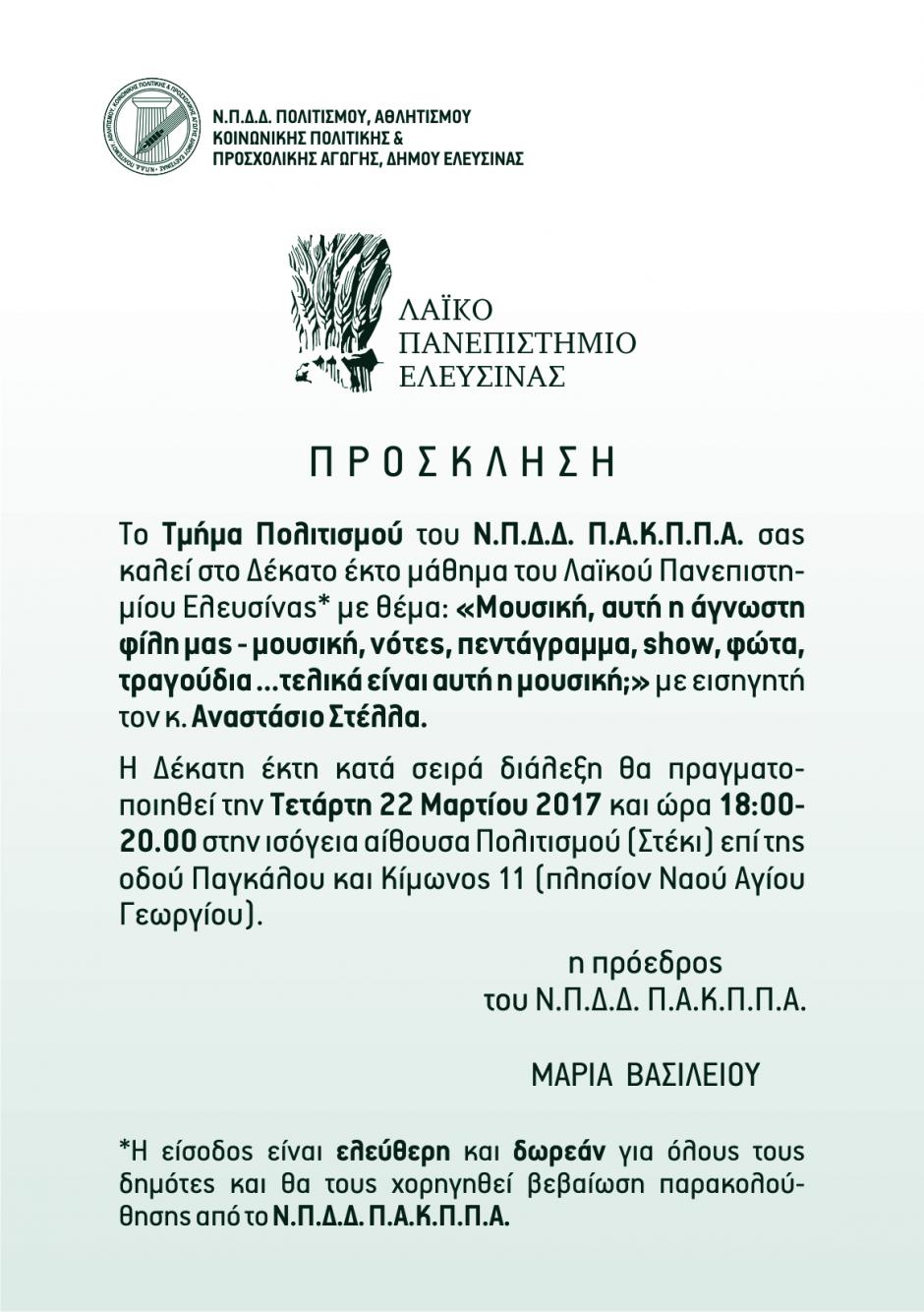 16ο μάθημα του Λαϊκού Πανεπιστημίου με θέμα: " Μουσική, αυτή η άγνωστη φίλη μας-μουσική, νότες , πεντάγραμμα, show, φώτα, τραγούδια... τελικά είναι αυτή η μουσική;" με εισηγητή τον κ. Αναστάσιο Στέλλα.