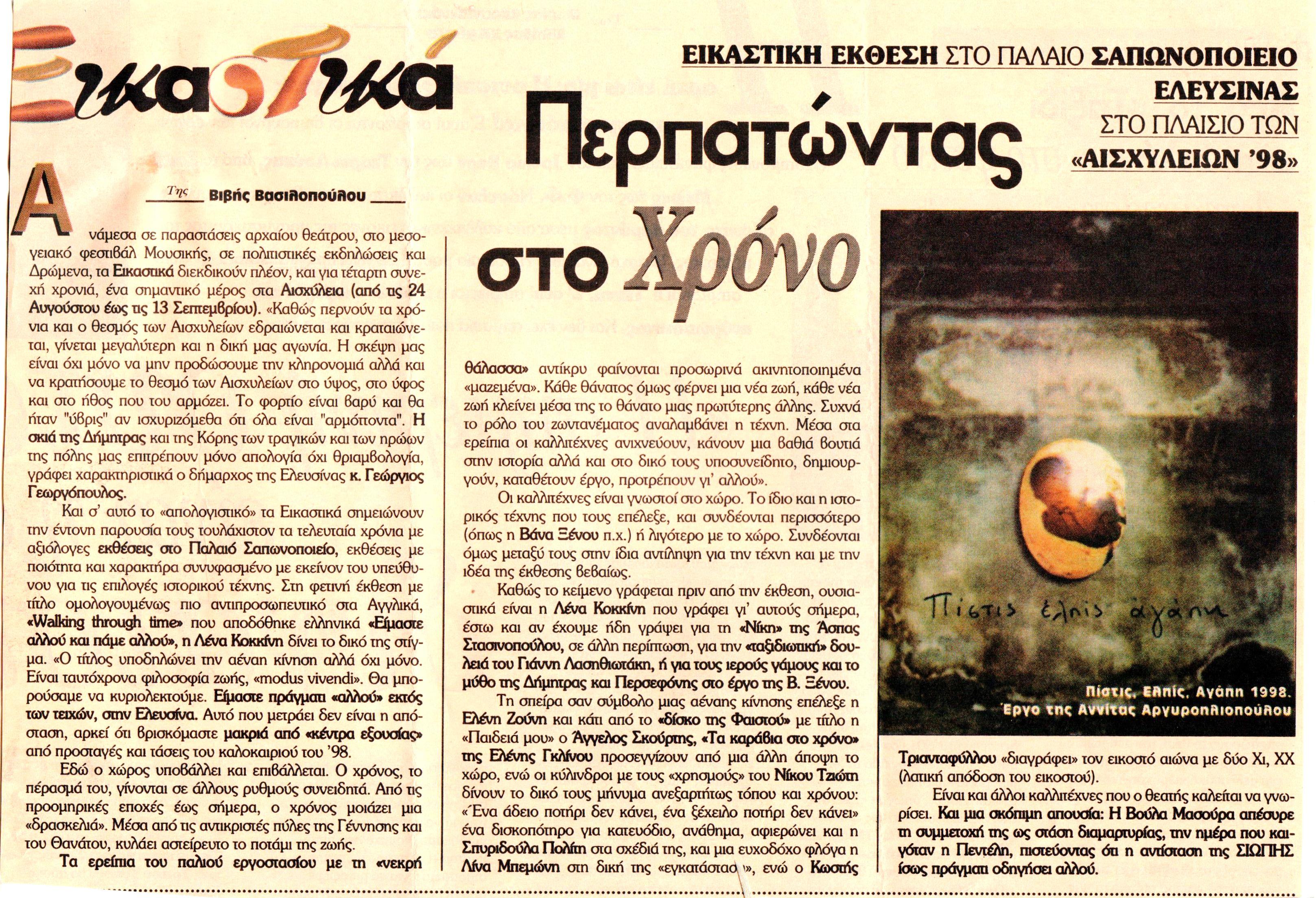 Πιθανά λόγια συγγραφέα: "Ανάμεσα σε παραστάσεις αρχαίου θεάτρου, στο μεσογειακό φεστιβάλ Μουσικής, σε πολιτιστικές εκδηλώσεις και δρώμενα, τα Εικαστικά διεκδικούν…"
