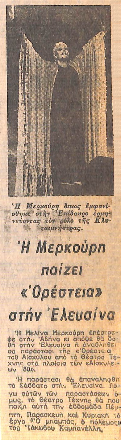 Άρθρο "Η Μερκούρη παίζει 'Ορέστεια' στην Ελευσίνα"