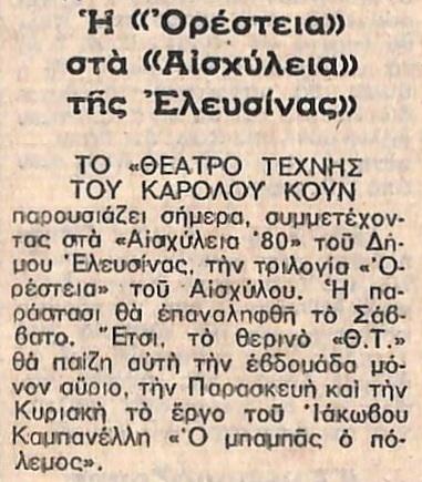 Πιθανά λόγια συγγραφέα: "Το Θέατρο Τέχνης Καρόλου Κουν παρουσιάζει, σήμερα, συμμετέχοντας στα 'Αισχύλεια 80' του Δήμου Ελευσίνας, την τριλογία…"