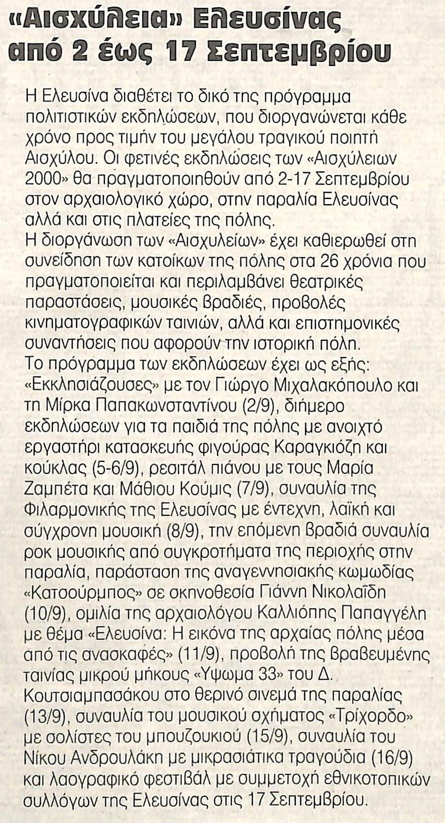 Πιθανά λόγια συγγραφέα: Η Ελευσίνα διαθέτει το δικό της πρόγραμμα πολιτιστικών εκδηλώσεων, που διοργανώνεται……