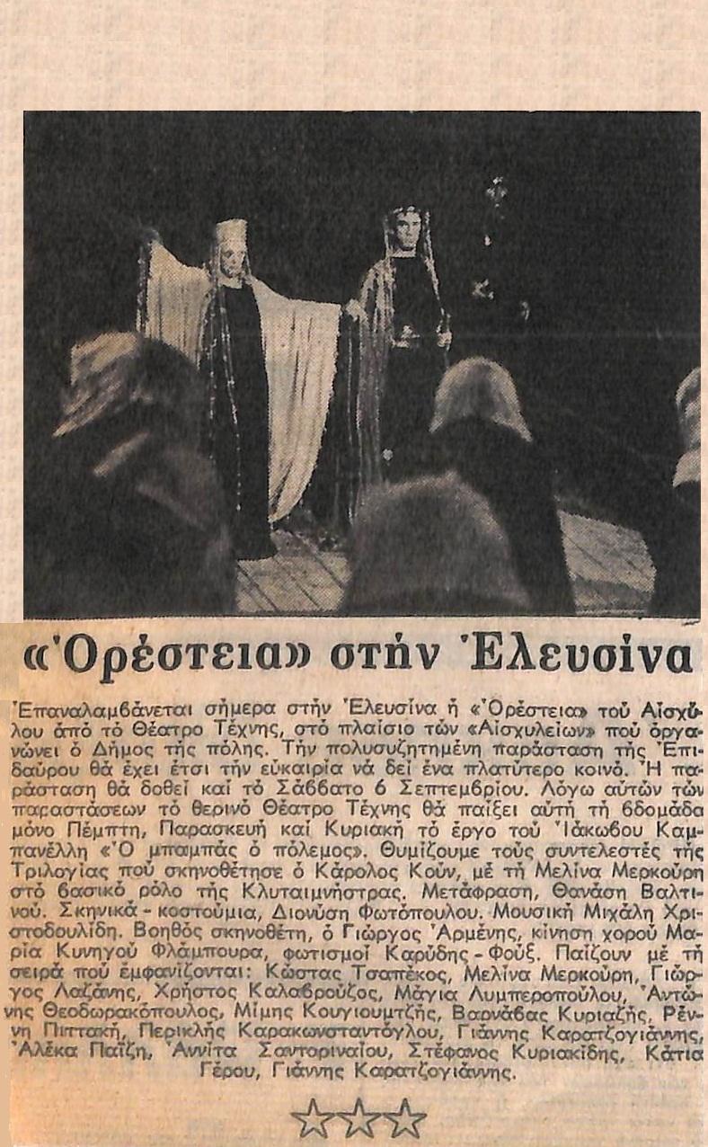 Πιθανά λόγια συγγραφέα: "Επαναλαμβάνεται σήμερα στην Ελευσίνα η 'Ορέστεια' του Αισχύλου από το Θέατρο Τέχνης, στο πλαίσιο των 'Αισχυλείων' που οργανώνει…"