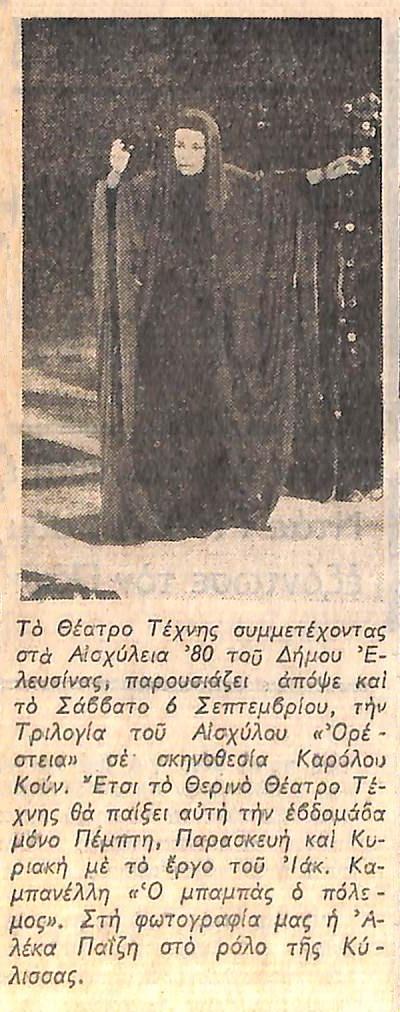 Πιθανά λόγια συγγραφέα: "Το Θέατρο Τέχνης συμμετέχοντας στα Αισχύλεια 80 του Δήμου Ελευσίνας, παρουσιάζει…"