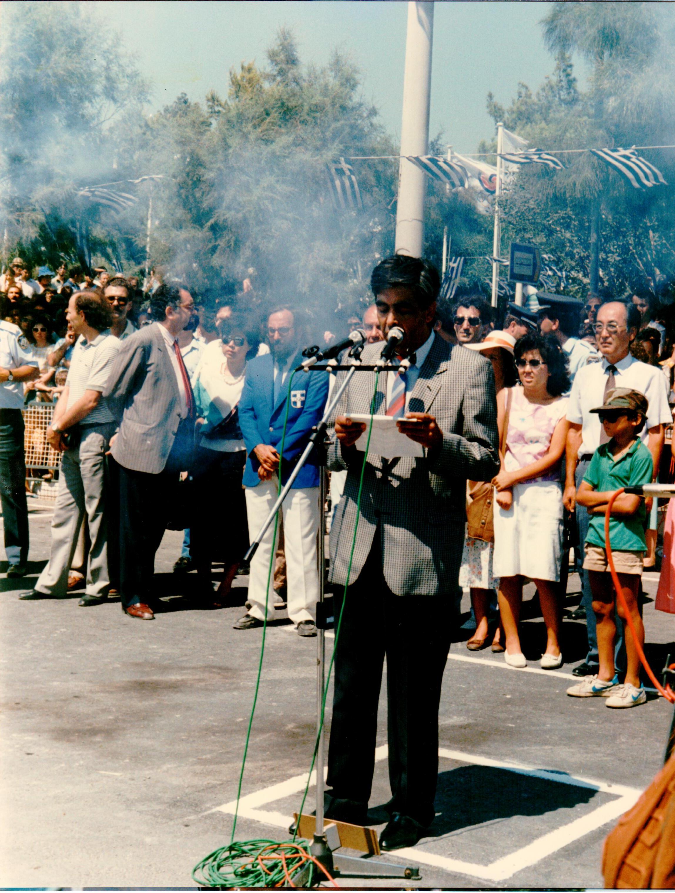 Εκδήληλωση για την αφή της Ολυμπιακής Φλόγας των Ολυμπιακών Αγώνων της Σεουλ 1988, με χορευτικά συγκροτήματα, τη Φιλαρμονική του Δήμου Ελευσίνας, κορεάτες μουσικοί, ελληνίδες ιέριες, την τριήρης " Ολυμπιάς"