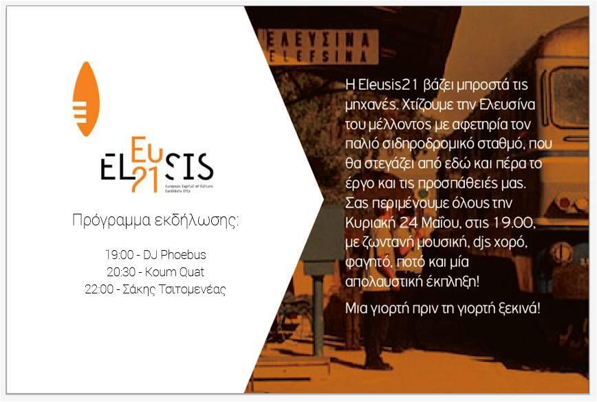 H διεκδίκηση της Πολιτιστικής Πρωτεύουσας της Ευρώπης είναι υπόθεση όλης της πόλης και ήδη ένας μεγάλος αριθμός πολιτών και φορέων έχουν συστρατευθεί σε αυτή την προσπάθεια, υποστηρίζοντας ενεργά το έργο της Eleusis21. Για το πάρτυ εγκαινίων του Σιδηροδρομικού Σταθμού, τρεις επιχειρήσεις εστίασης της πόλης, το Επί Περικλέους cafe-bar, ο Κυκεών Bar Cafe και το ΡΑΚΟΥΝ ένωσαν τις δυνάμεις τους και προσέφεραν τις υπηρεσίες τους και τον εξοπλισμό τους για τη διοργάνωση αυτής της Γιορτής πριν τη Μεγάλη Γιορτή του 2021.