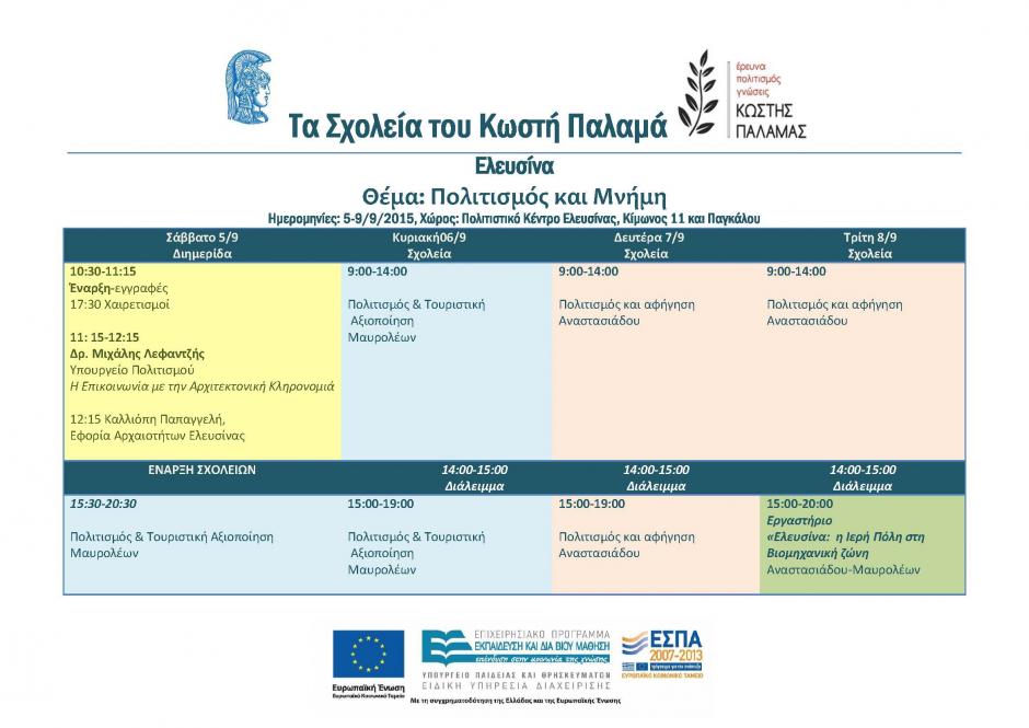 •Το «Σχολείο» του προγράμματος «Κωστή Παλαμά» θα πραγματοποιηθεί στην Ελευσίνα στις 5-8 Σεπτεμβρίου 2015 με θέμα: «Πολιτισμός και Μνήμη» στο Πολιτιστικό Κέντρο Ελευσίνας, Κίμωνος 11 και Παγκάλου.