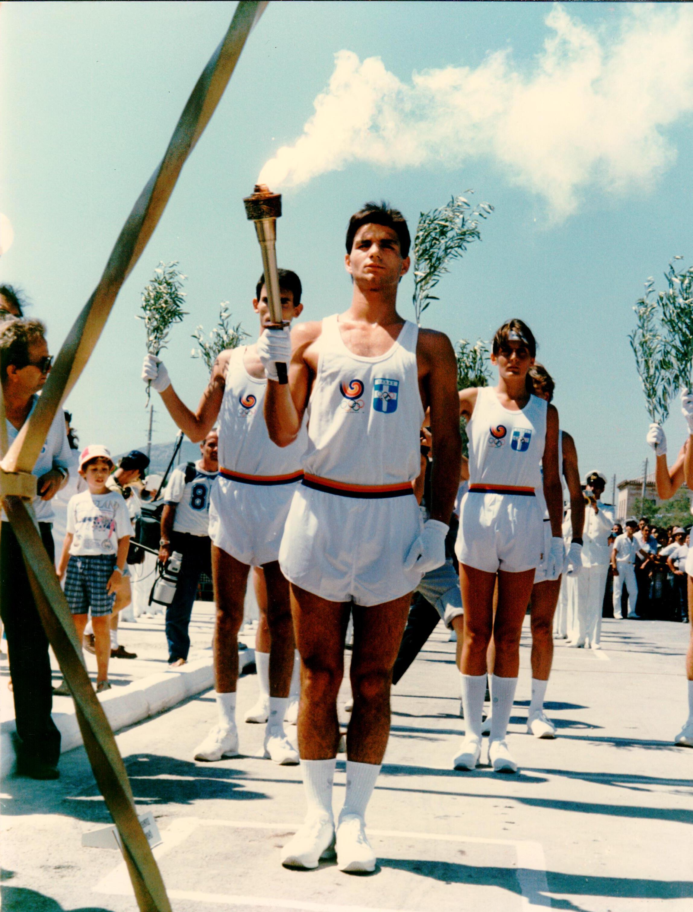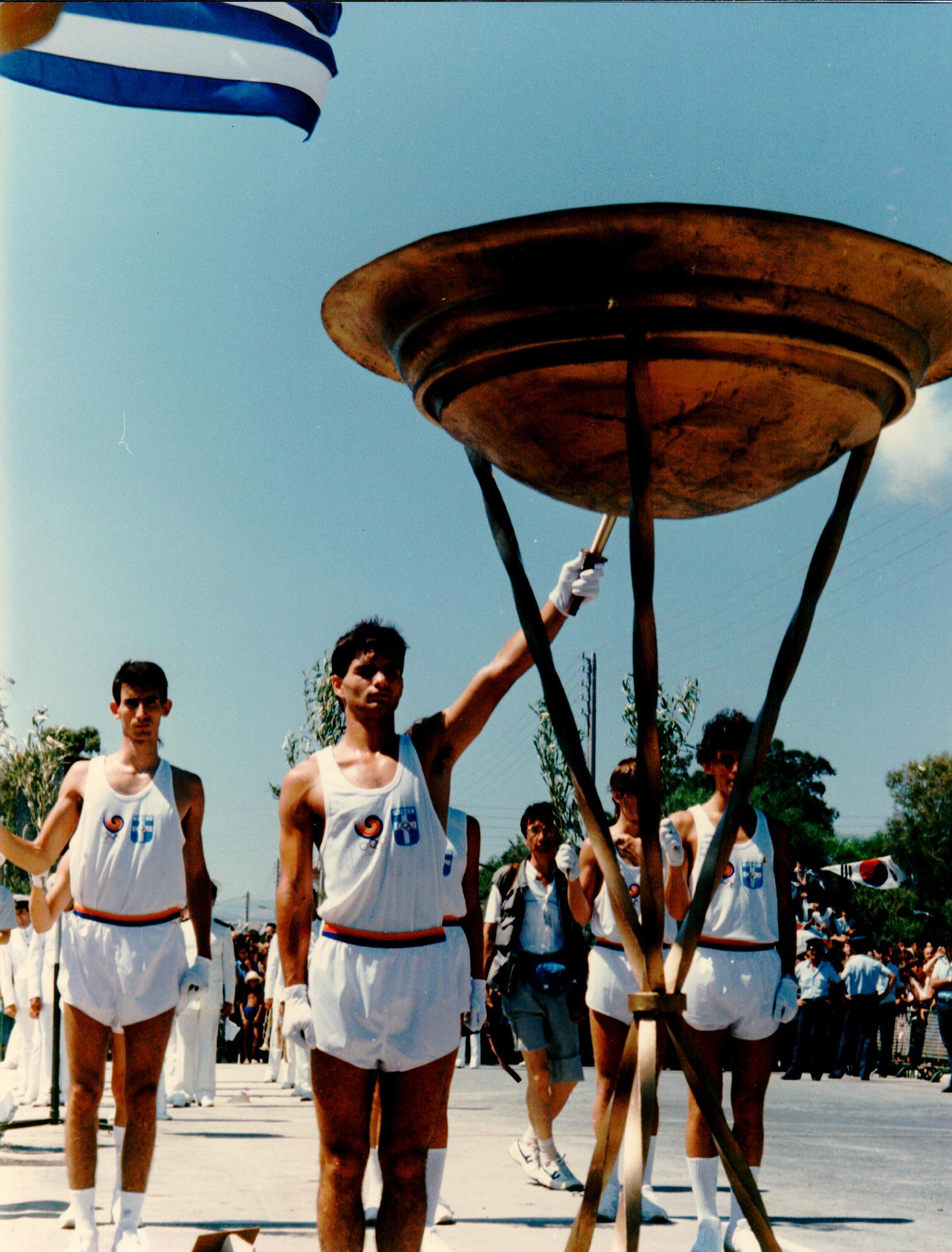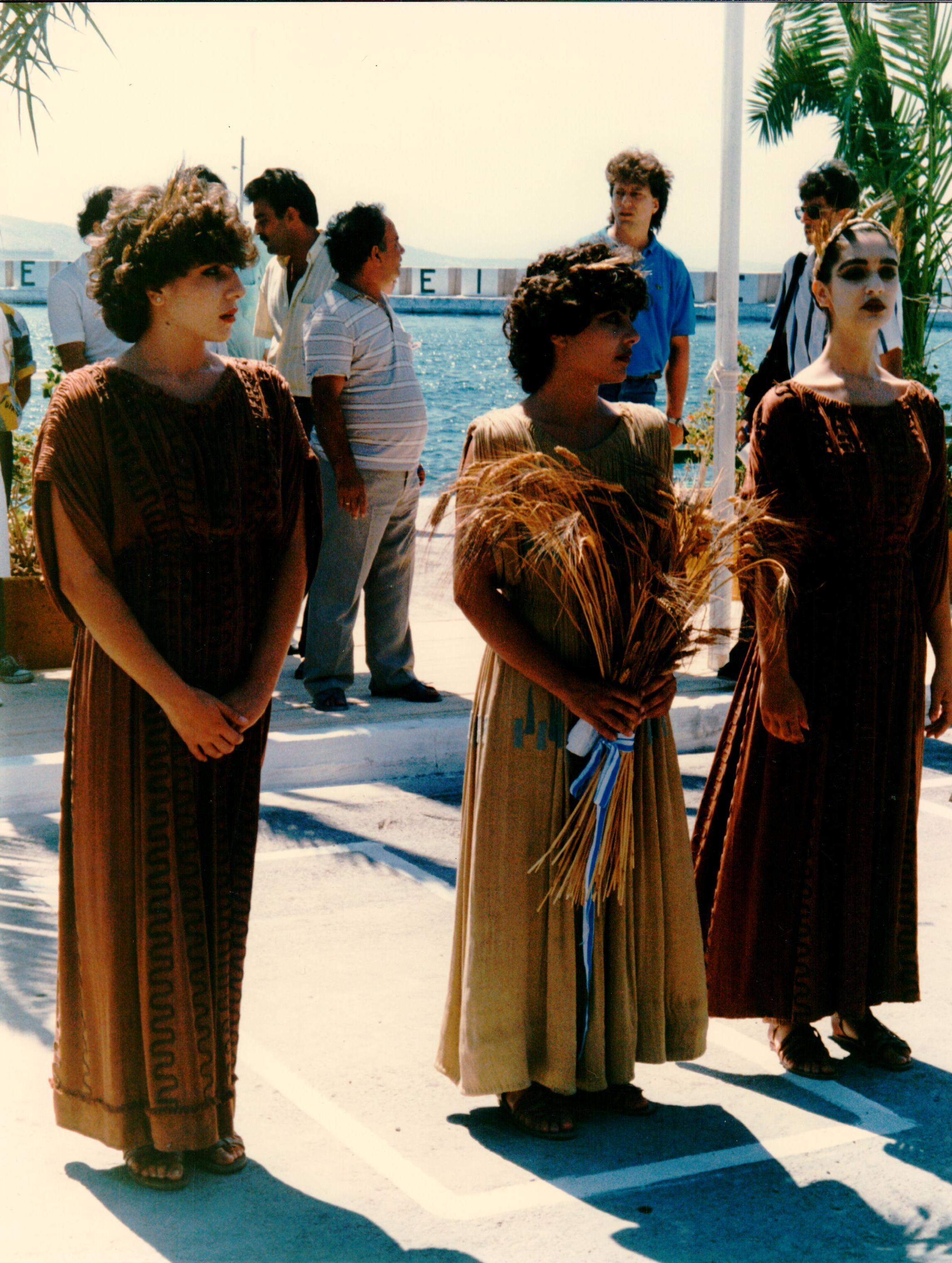Εκδήληλωση για την αφή της Ολυμπιακής Φλόγας των Ολυμπιακών Αγώνων της Σεουλ 1988, με χορευτικά συγκροτήματα, τη Φιλαρμονική του Δήμου Ελευσίνας, κορεάτες μουσικοί, ελληνίδες ιέριες, την τριήρης " Ολυμπιάς"