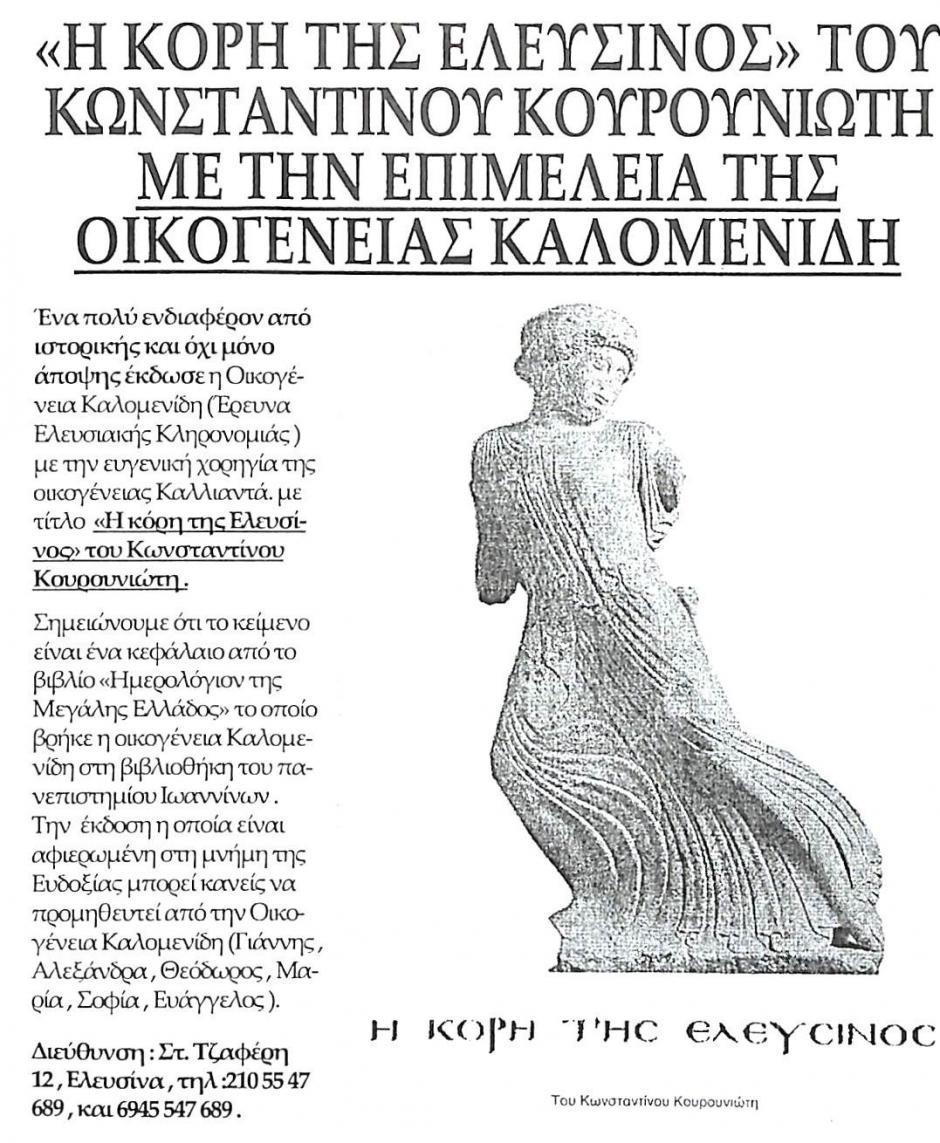 "Ένα πολύ ενδιαφέρον από ιστορικής και όχι μόνο άποψης έκδωσε η Οικογένεια Καλομενίδη (Έρευνα Ελευσινιακής Κληρονομιάς) με την ευγενική χορηγία της οικογένειας Καλλιαντά, με τίτλο 'Η κόρη της ελευσινος' του Κωνσταντίνου Κουρουνιώτη."