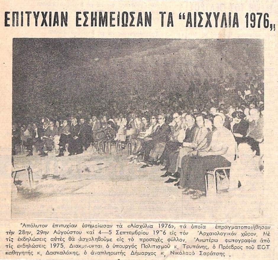 Πιθανά λόγια συγγραφέα: "Απόλυτον επιτυχίαν εσημείωσαν τα 'Αισχύλεια 1976', τα οποία επραγματοποιήθησαν την 28ην, 29ην Αυγούστου και…"