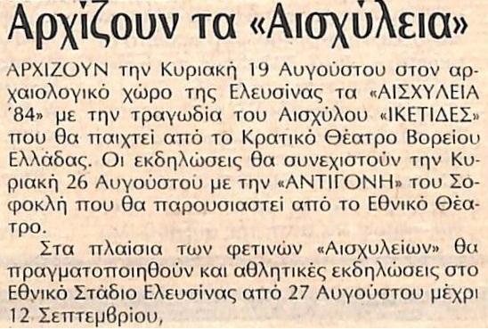 Πιθανά λόγια συγγραφέα: "…Αρχίζουν την Κυριακή 19 Αυγούστου στον αρχαιολογικό χώρο της Ελευσίνας τα 'ΑΙΣΧΥΛΕΙΑ ΄84' με την τραγωδία …"