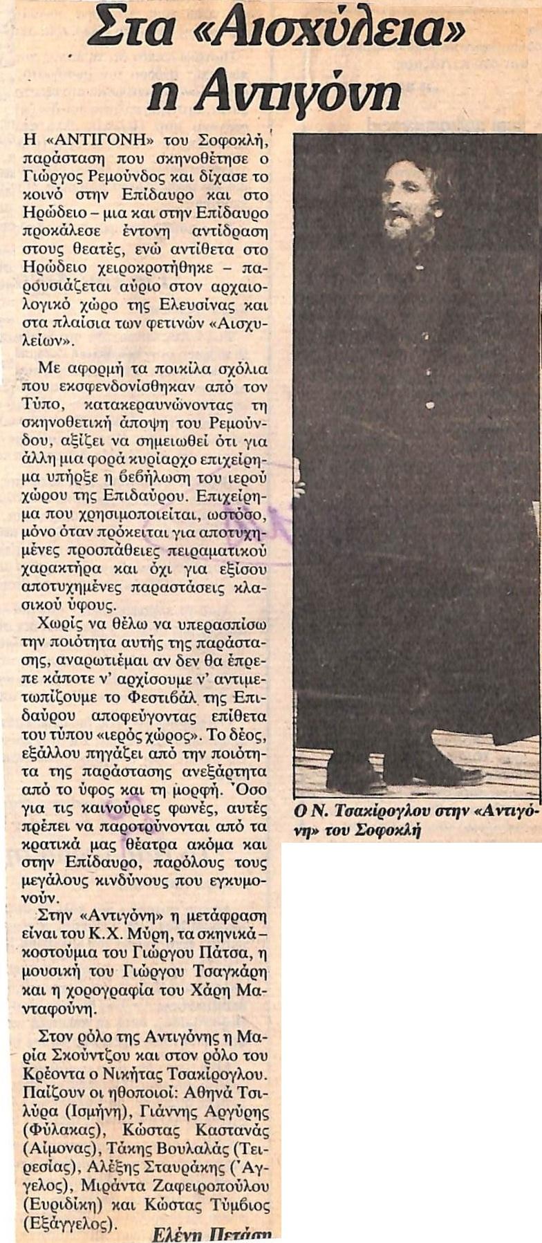 Πιθανά λόγια συγγραφέα: "…Η 'Αντιγόνη' του Σοφοκλή, παράσταση που σκηνοθέτησε ο Γιώργος Ρεμούνδος και δίχασε το κοινό στην Επίδαυρο και στο Ηρώδειο - μια και στην Επίδαυρο…"