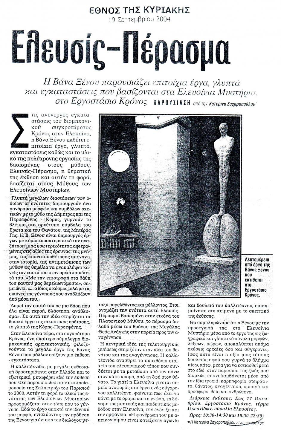 Πιθανά λόγια συγγραφέα: "Στις ανενεργές εγκαταστάσεις τουβιομηχανικού συγκροτήματος Κρόνος στην Ελευσίνα, η Νάνα Ξένου εκθέτει επιτοίχια έργα, γλυπτά, εγκαταστάσεις καθώς και το υλικό της πολύχρονης εργασίας της…"