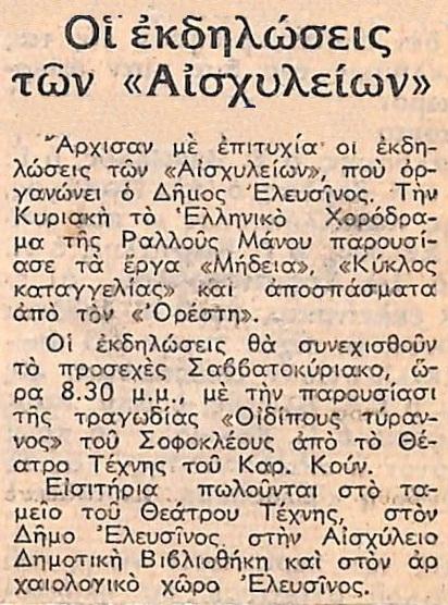 Πιθανά λόγια συγγραφέα: "Άρχισαν με επιτυχία οι εκδηλώσεις των 'Αισχυλείων', που οργανώνει ο Δήμος Ελευσίνας. Την Κυριακή…"