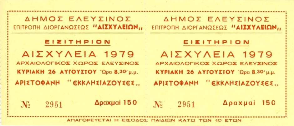 Εισιτήριο για τη Θεατρική παράσταση "Εκκλησιάζουσες" στις 19 Αυγούστου 1979 στον Αρχαιολογικό χώρο Ελευσίνας